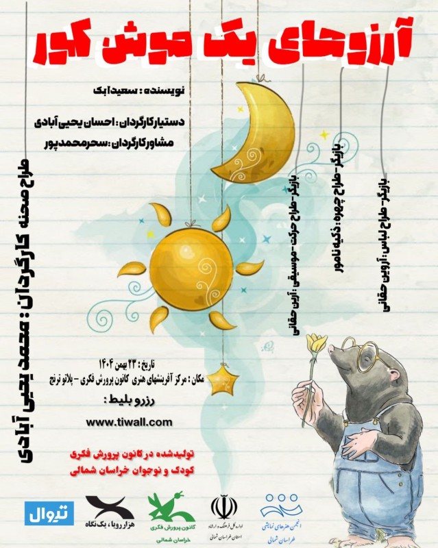 داستان آرزوی یک موش کور است که برای رسیدن به خورشید که آرزوی او است به روی زمین می آید و موانع مختلف می رسد.