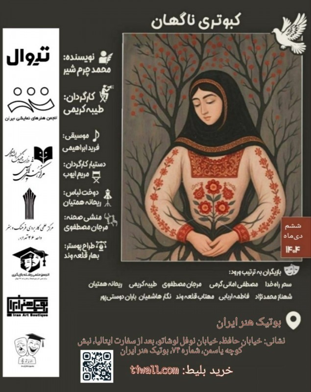 توجه مهم: این نمایش راس ساعت ورود آغاز میشود و به هیچ عنوان حتی ۳۰ ثانیه پس از بسته شدن درب سالن و آغاز نمایش، ورود به سالن امکان پذیر نیست. با توجه به ترافیک محدوده خیابان نوفل لوشاتو و ولیعصر لطفا حتما ۳۰ دقیقه زودتر در بوتیک هنر ایران حضور داشته باشید. برای مخاطبان محترمی که به هر دلیلی مجبور میشوند در حین اجرا سالن را ترک کنند، برگشت دوباره به سالن امکان پذیر نیست. بلیت پس از آغاز برنامه اعتبار و امکان ورود ندارد و بلیت در اختیار سالن و گروه نمایشی قرار میگیرد و امکان جابجایی نیست.