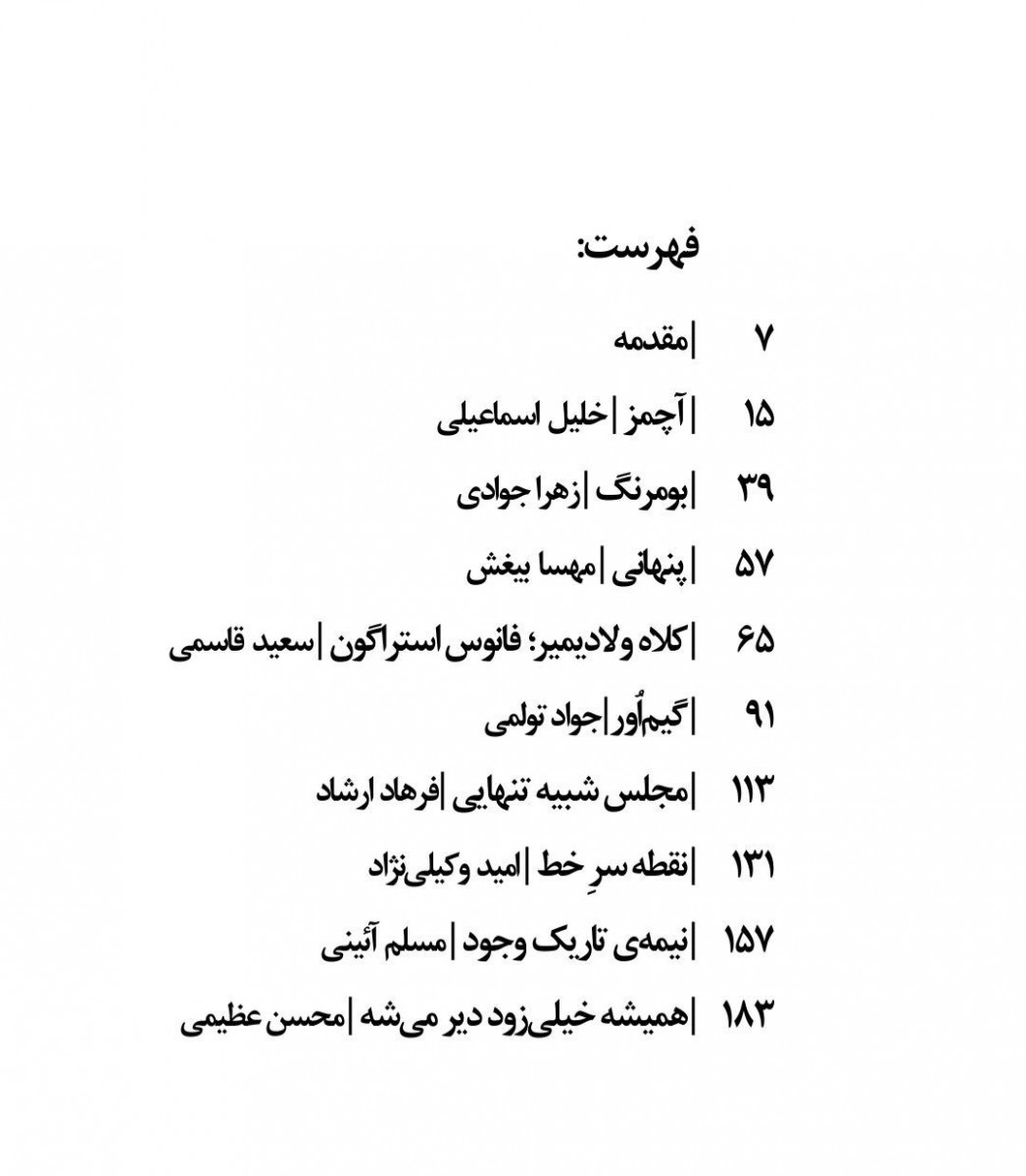 دفتر اول متادارما شامل ۹ نمایشنامهی متادرام از نویسندگان مختلف است و نمایشنامههای «آچمز» از خلیل اسماعیلی، «بومرنگ» به قلم زهرا جوادی، «پنهانی» نوشته ی مهسا بیغش، «کلاه ولادیمیر؛ فانوس استراگون» اثر سعید قاسمی، «گیم اُور» از جواد تولمی، «مجلس شبیه تنهایی» به قلم فرهاد ارشاد، «نقطه سرِ خط» نوشته ی امید وکیلی نژاد، «نیمه ی تاریک وجود» اثر مسلم آئینی، و نمایشنامه ی «همیشه خیلی زود دیر می شه» از محسن عظیمی را در بر می گیرد.